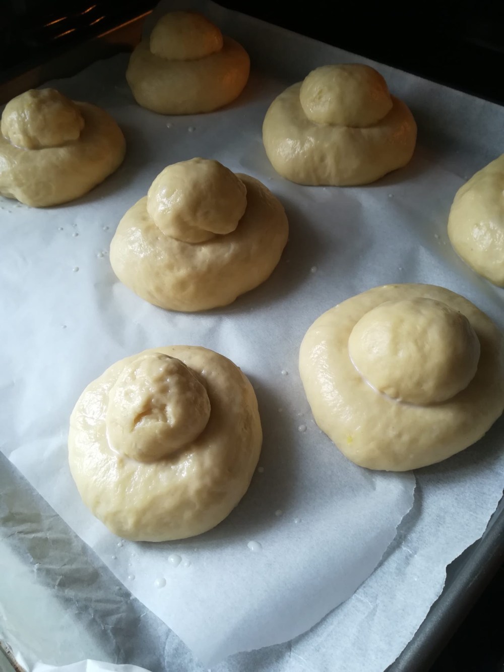 Dopo la lievitazione, ricaviamo otto palline grandi ed otto piccole. Lavoriamole bene in modo che siano lisce in superficie. Adagiamo la pallina più grande su una teglia foderata con carta forno, pratichiamo con le dita al centro un cratere e adagiamoci su la pallina più piccola e mettiamo nuovamente a lievitare.