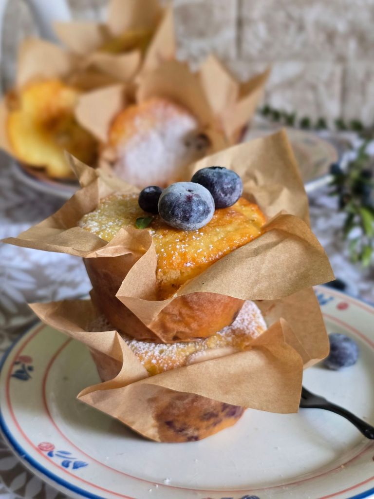 Riempiamo con l’ impasto i pirottini, fino a 3/4 dell’ involucro. Aggiungiamo sulla superficie i mirtilli che abbiamo tenuto a parte