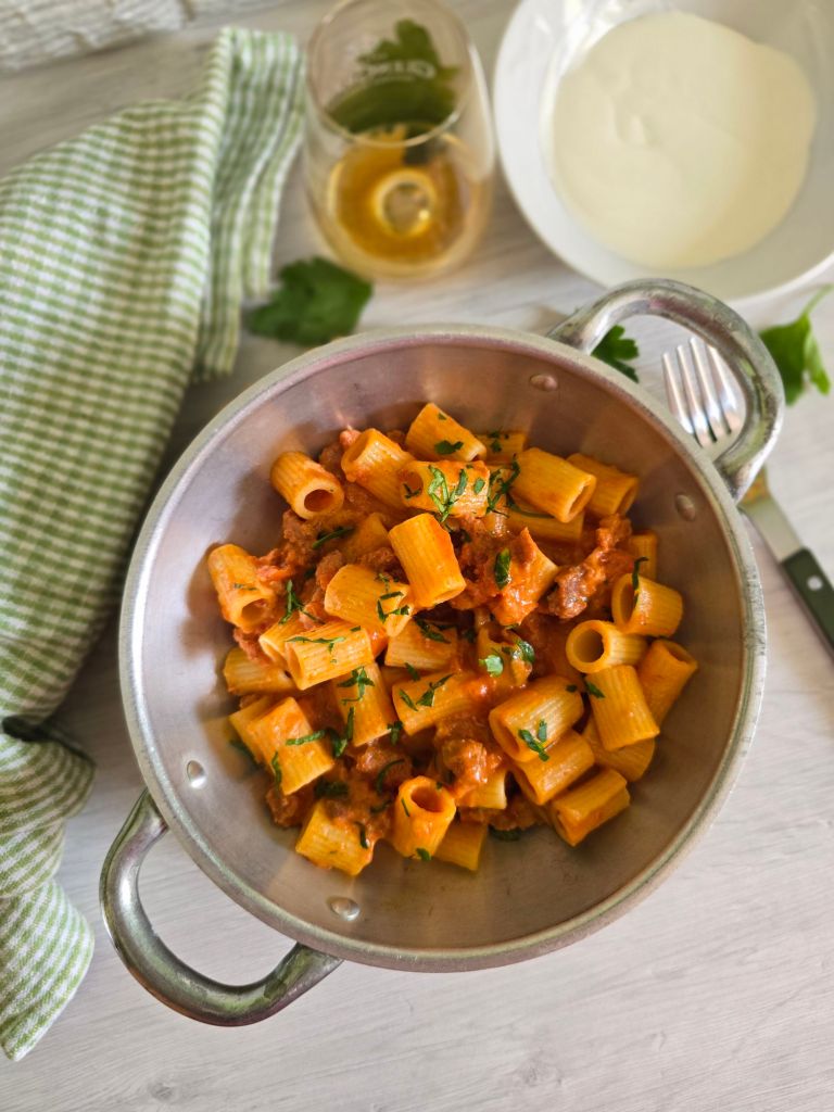 Facciamo cuocere lentamente qualche minuto. La salsiccia deve rimanere morbida. Di seguito ,sfumiamo con il brandy. Appena evaporato, aggiungiamo la passata. Cuociamo fino a che il sugo sia bello denso.