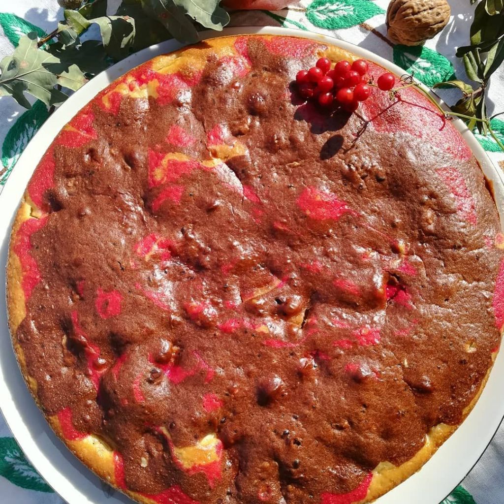 Componiamo il dolce. In una teglia imburrata da(22 cm) versa prima l’ impasto con le mele,sopra delicatamente versa l’ impasto rosso,ed infine quello al cioccolato,